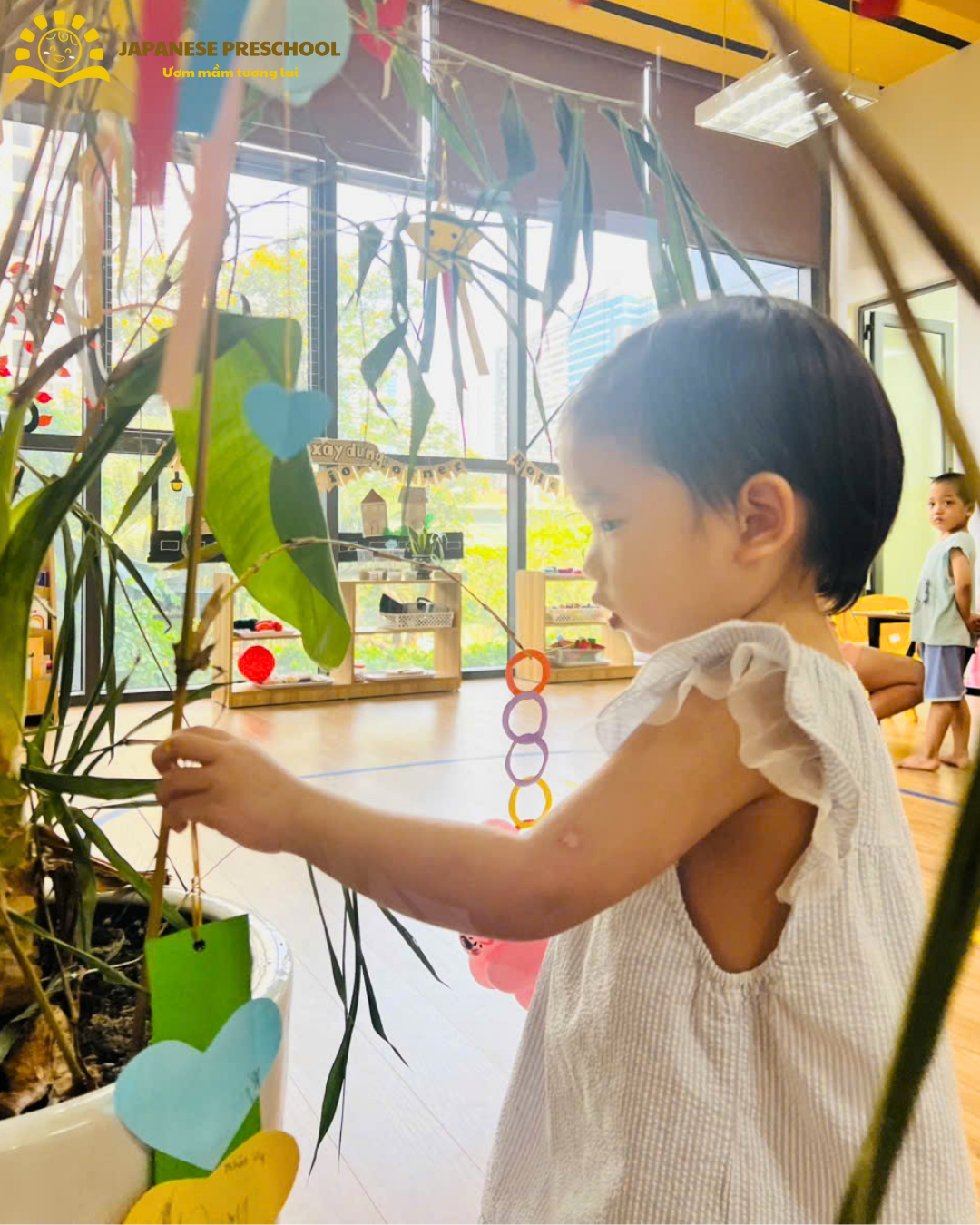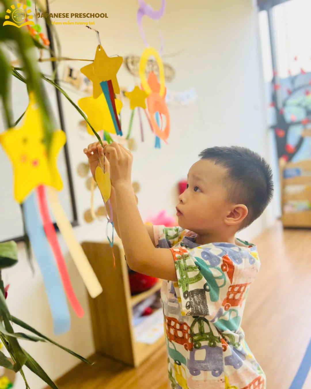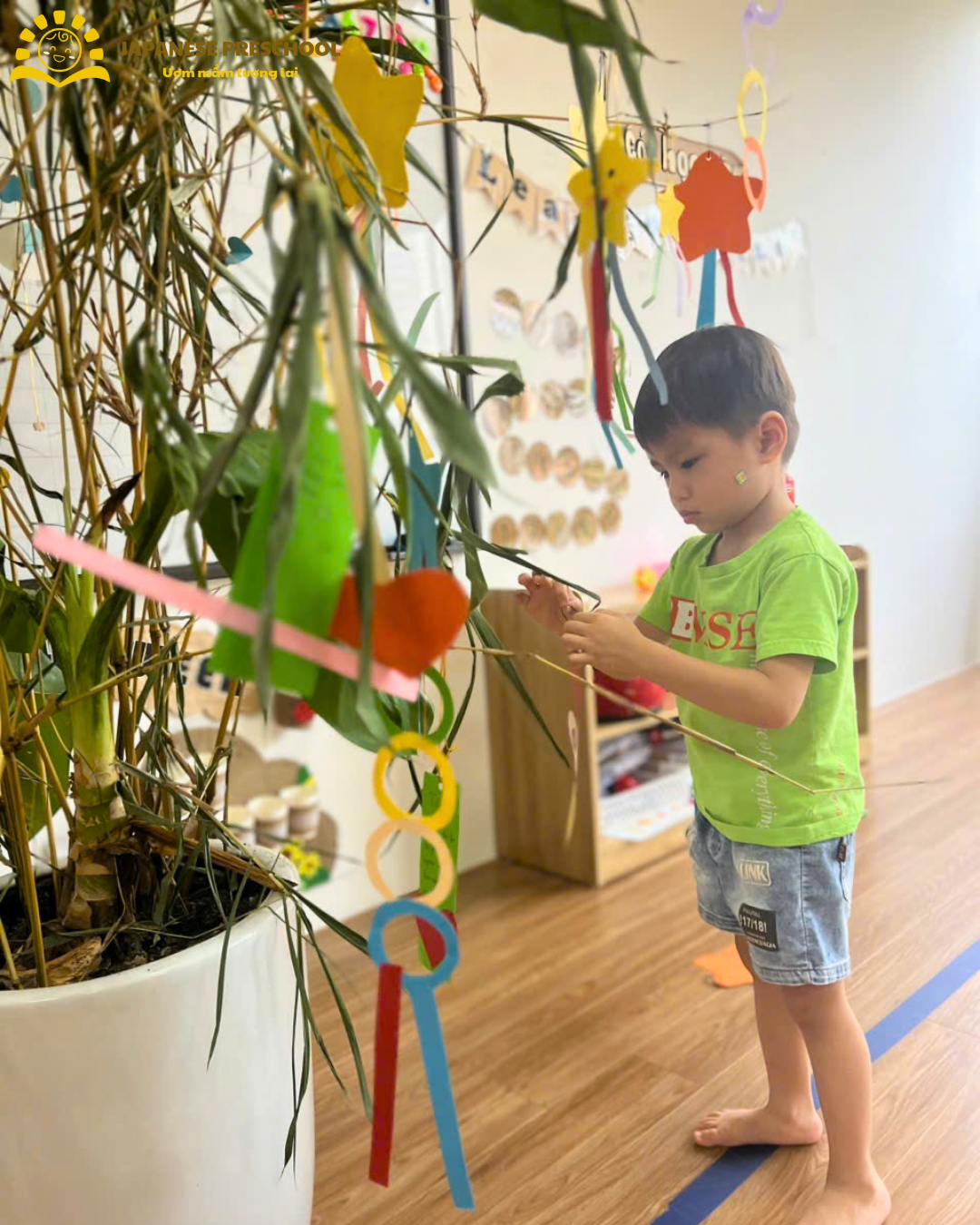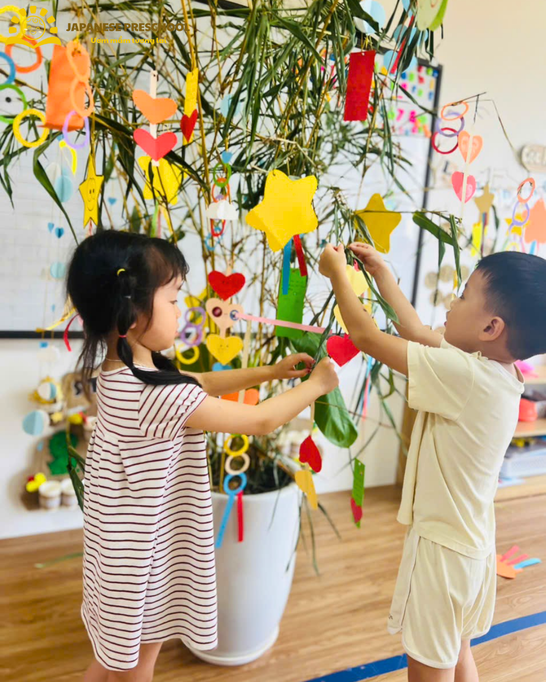 Không thể không kể đến hoạt động trang trí lễ hội Tanabata – một nét văn hóa truyền thống của Nhật Bản. Dưới đôi bàn tay khéo léo, các bạn nhỏ đã tự tay sáng tạo nên những món đồ trang trí đầy màu sắc, gửi gắm điều ước nhỏ bé của riêng mình.